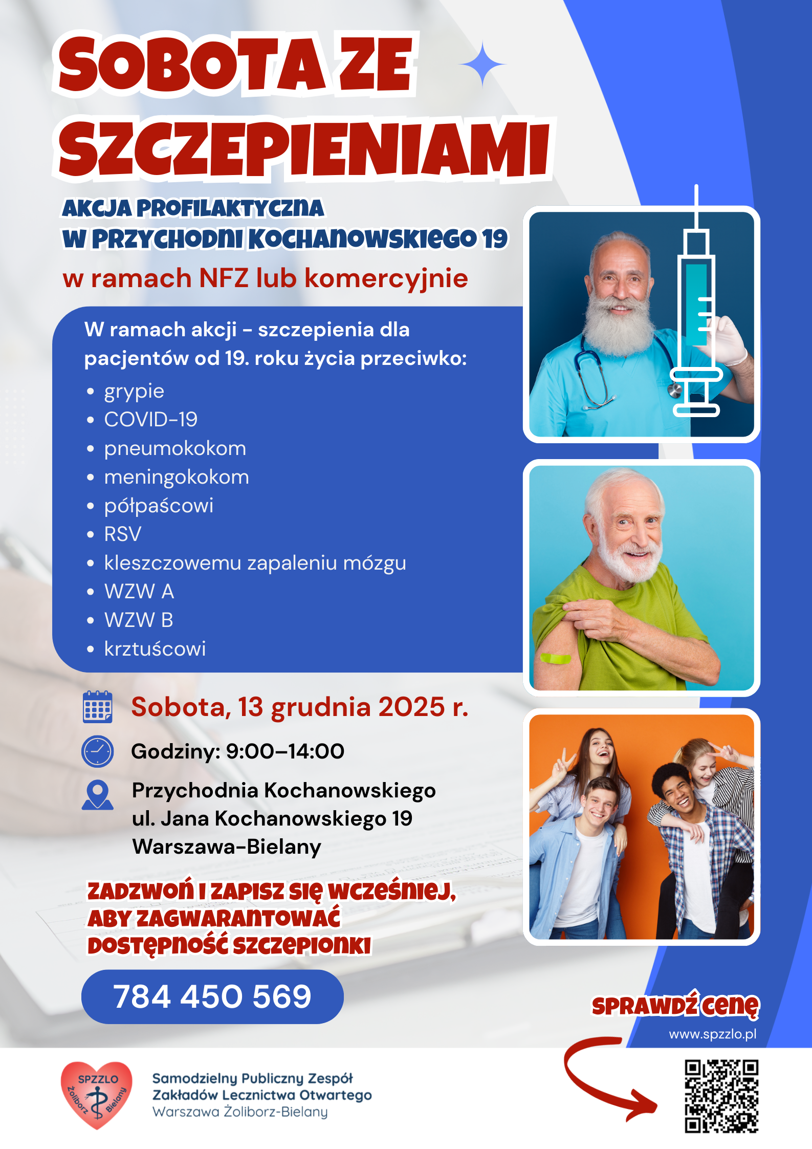 Już w sobotę, 13 grudnia 2025 r., w godzinach 9:00–14:00 zapraszamy do Przychodni Kochanowskiego 19 na specjalną akcję szczepień. W trakcie tej inicjatywy pacjenci od 19. roku życia mogą skorzystać z szerokiego zakresu szczepień ochronnych, zarówno w ramach NFZ, jak i komercyjnie.
